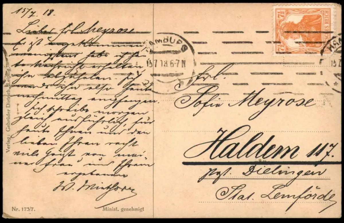 Gelaufen: 15.07.1918 mit Stempel Hamburg nach Haldem Post Dielingen