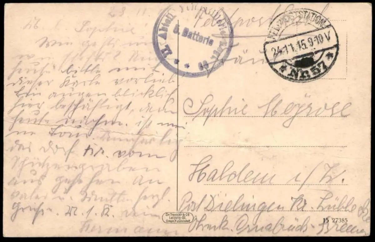 Gelaufen: 24.11.1915 mit Stempel Feldpoststation Nr. 57 nach Haldem Post Dielingen