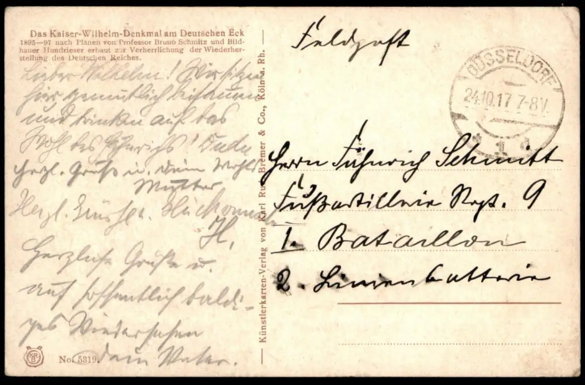 Gelaufen: 24.10.1917 als Feldpost mit Stempel Düsseldorf an 9. Fußartillerie Regiment 1. Bataillon