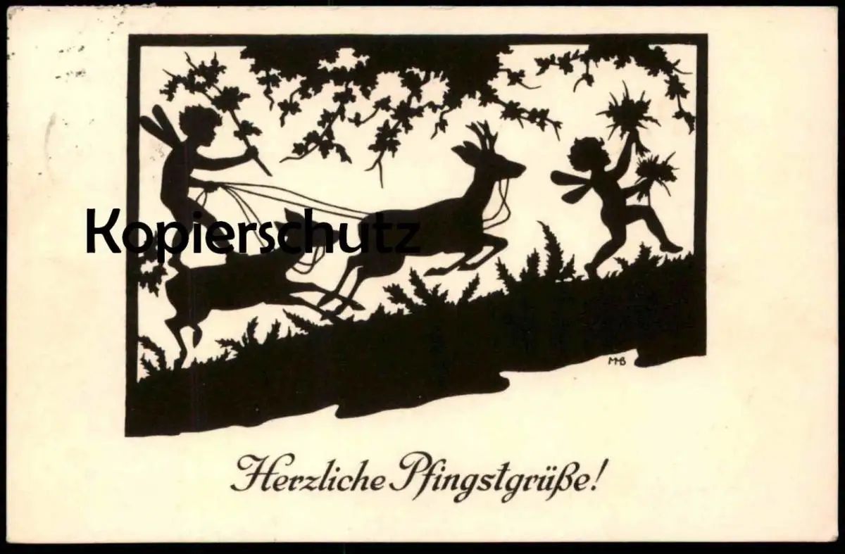 ALTE KÜNSTLER POSTKARTE HERZLICHE PFINGSTGRÜSSE! MARIE M. BEHRENS SCHERENSCHNITT ELFEN REHE ELFE REH OPPEL HESS JENA AK
