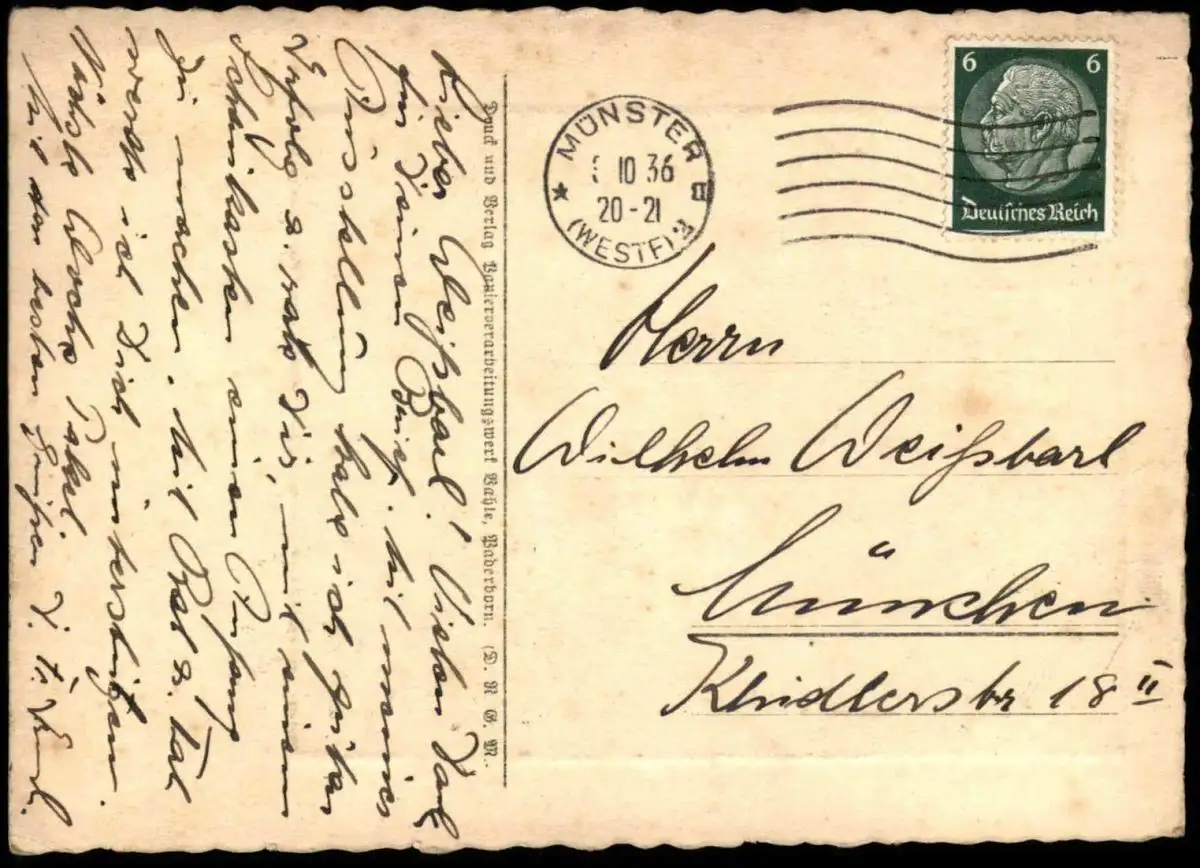 Gelaufen: 03.10.1936 mit Stempel Münster nach MünchenErhaltung (s. Scan): gut - mittel, gezähnter Rand nicht durchgängig / 915511