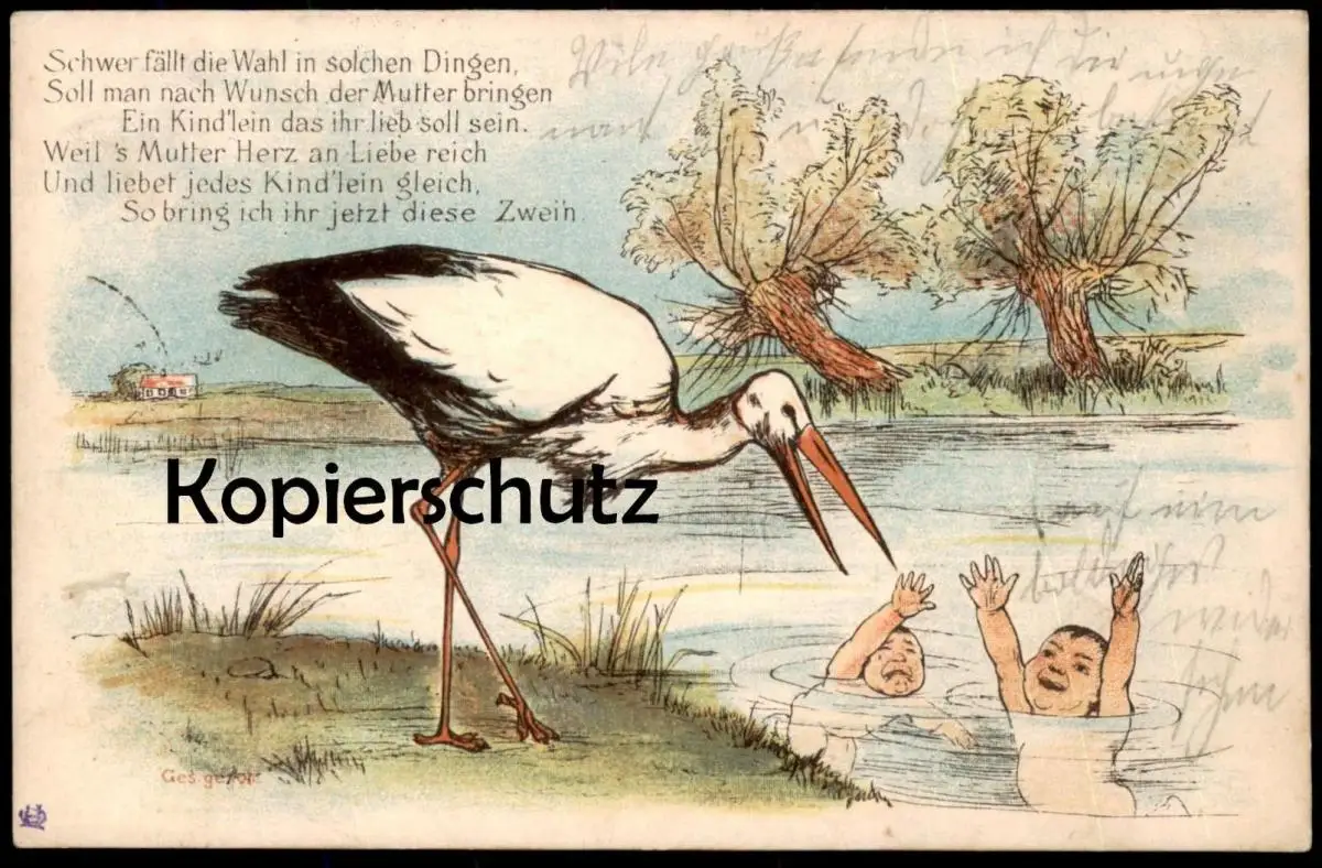 ALTE HUMOR-POSTKARTE STORCH ZWILLINGE SCHWER FÄLLT DIE WAHL IN SOLCHEN DINGEN SOLL MAN NACH WUNSCH DER MUTTER BRINGEN EIN KINDLEIN DAS IHR LIEB SOLL SEIN WEILS MUTTER HERZ AN LIEBE REICH UND LIEBER JEDES KINDLEIN GLEICH SO BRING ICH IHR JETZT DIESE ZWEIVerlag: unbekannt