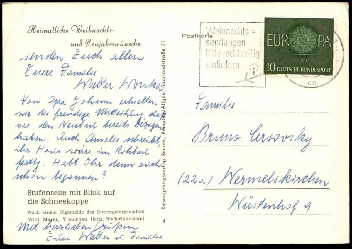 ALTE KÜNSTLER POSTKARTE STUFENSEITE MIT BLICK AUF DIE SCHNEEKOPPE RIESENGEBIRGE NACH EINEM ÖLGEMÄLDE DES RIESENGEBIRGSMALERS WILLI MAYER TRAUTENAU (JETZT NIEDERLAHNSTEIN) HEIMATLICHE WEIHNACHTS- UND NEUJAHRSGRÜSSE