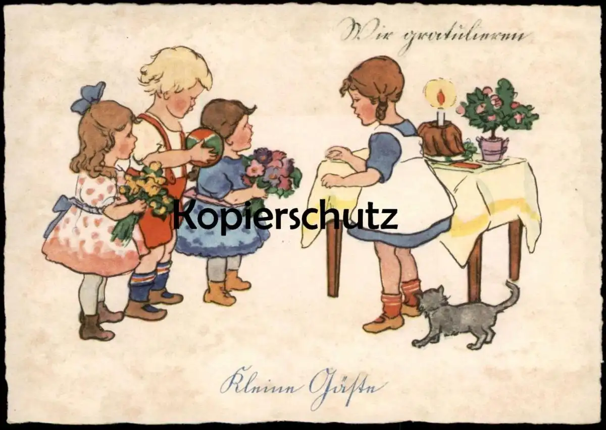 ALTE KÜNSTLER POSTKARTE WIR GRATULIEREN KLEINE GÄSTE KINDER MÄDCHEN KATZE GEBURTSTAG KUCHEN RENATE DRUDEVerlag: Bischof & Klein, Lengerich