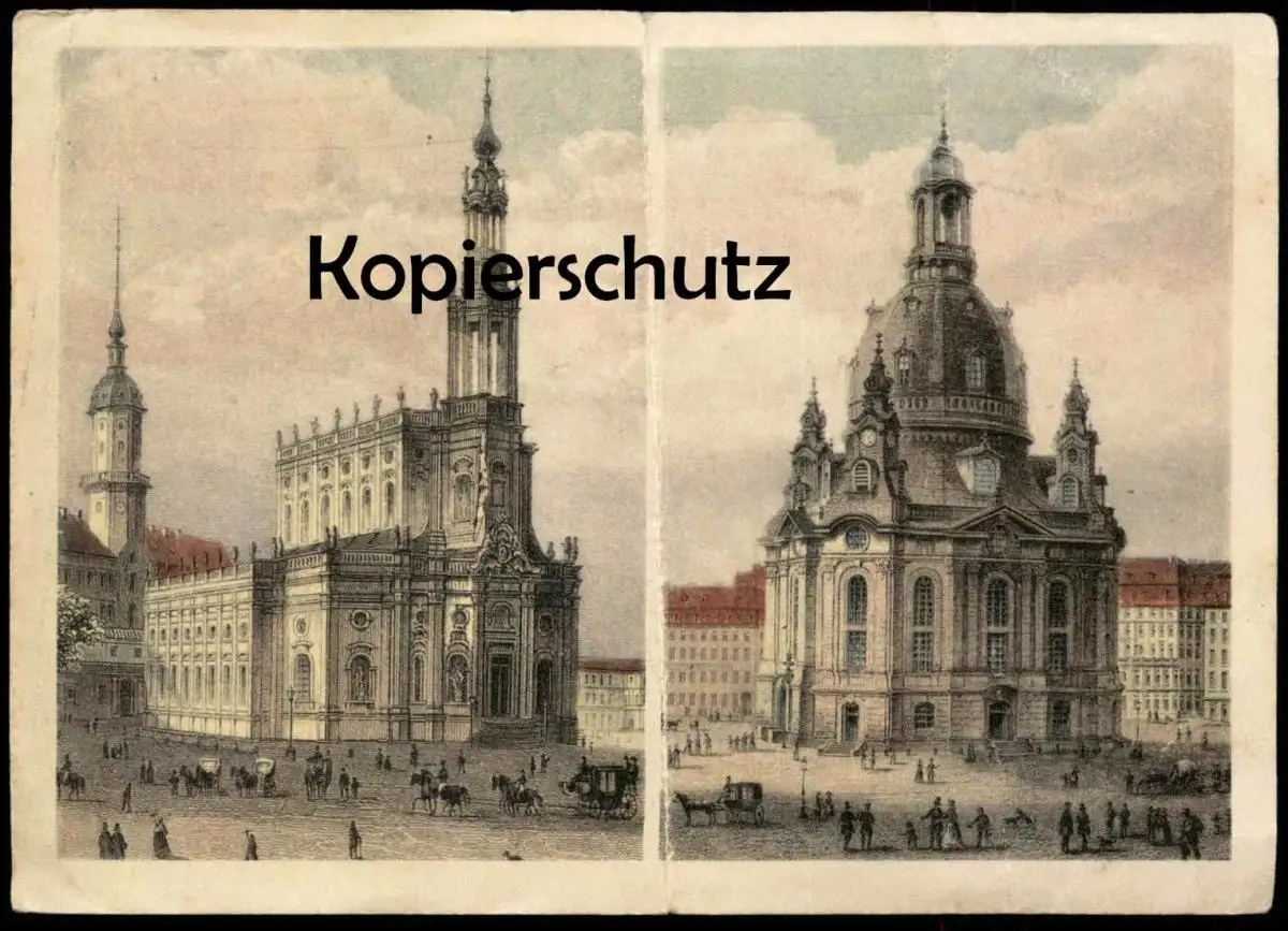 ALTE LITHO POSTKARTE DRESDEN UM 1850 HOFKIRCHE UND FRAUENKIRCHE