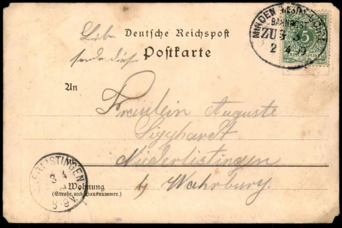 Gelaufen: 02.04.1899 mit Bahnpoststempel Minden - Uchte nach Niederlistingen bei Wahrburg / WarburgErhaltung (s. Scan): schlechter, alle Ecken beschädigt / 915674