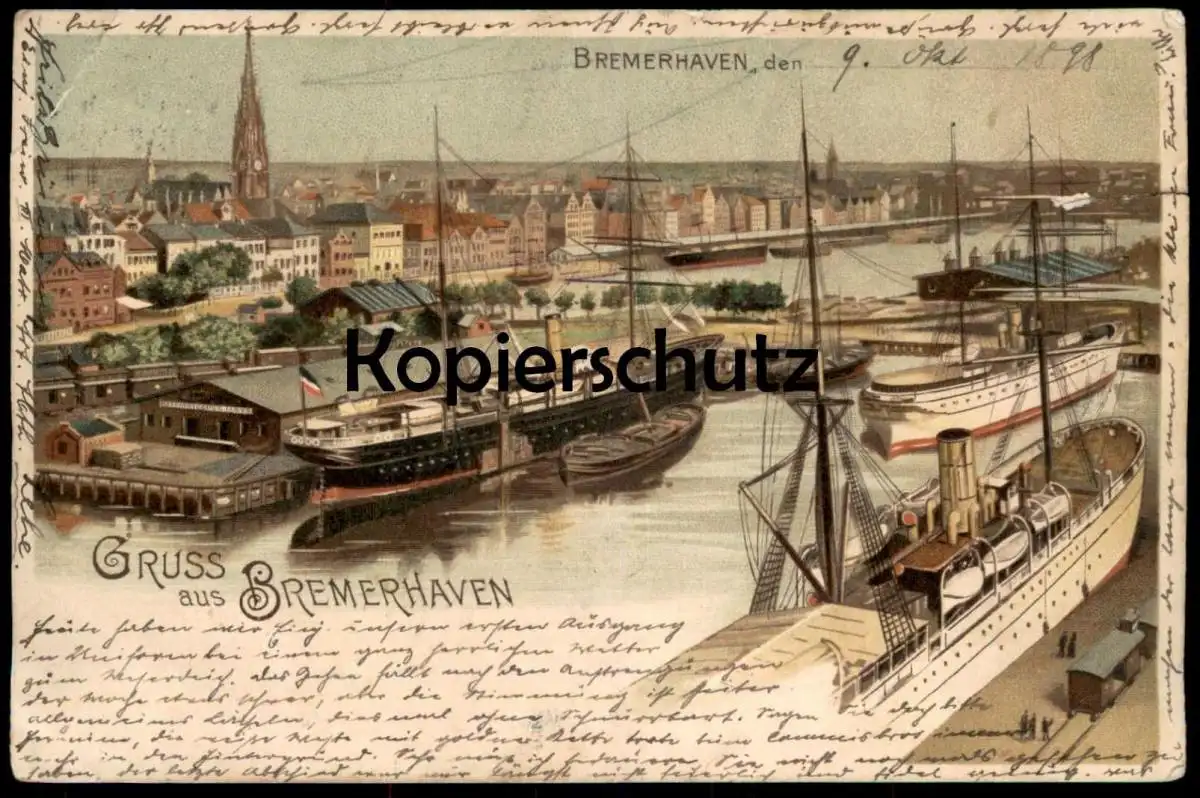 ALTE LITHO POSTKARTE GRUSS AUS BREMERHAVEN DAMPFER PANORAMA HAFEN harbour Schiff Schiffe ship Ansichtskarte postcard cpa