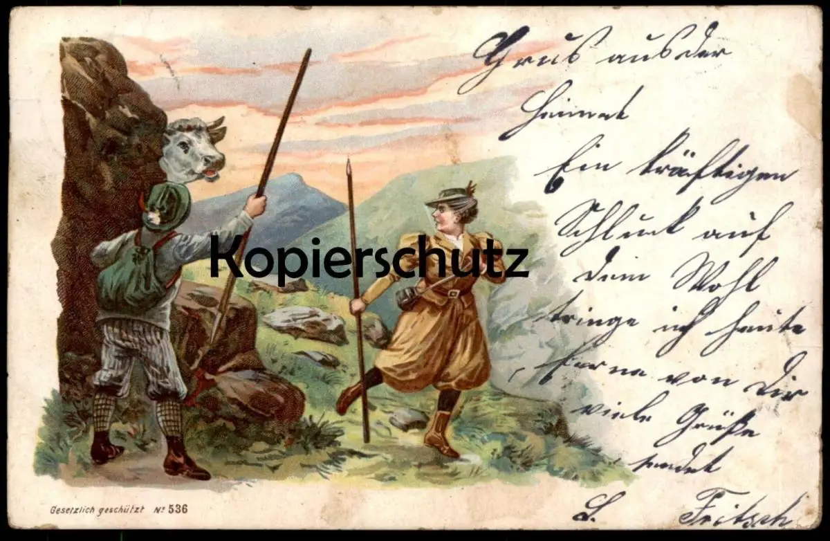 ALTE LITHO POSTKARTE GRUSS AUS DEN BERGEN KUH WANDERER cow vache Montagnes Humor Humour Ansichtskarte AK cpa postcard