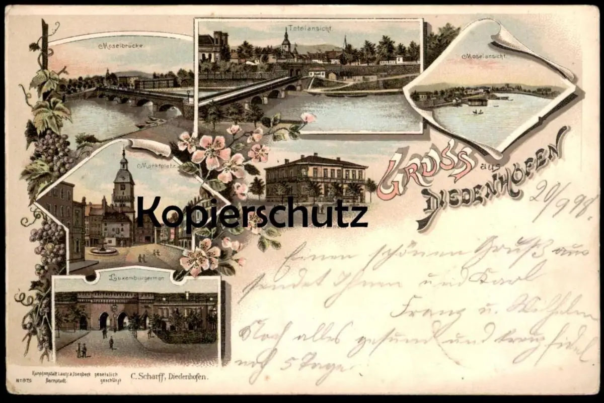 ALTE LITHO POSTKARTE GRUSS AUS DIEDENHOFEN THIONVILLE LUXEMBOURGERTHOR GOUVERNEMENT MARKTPLATZ