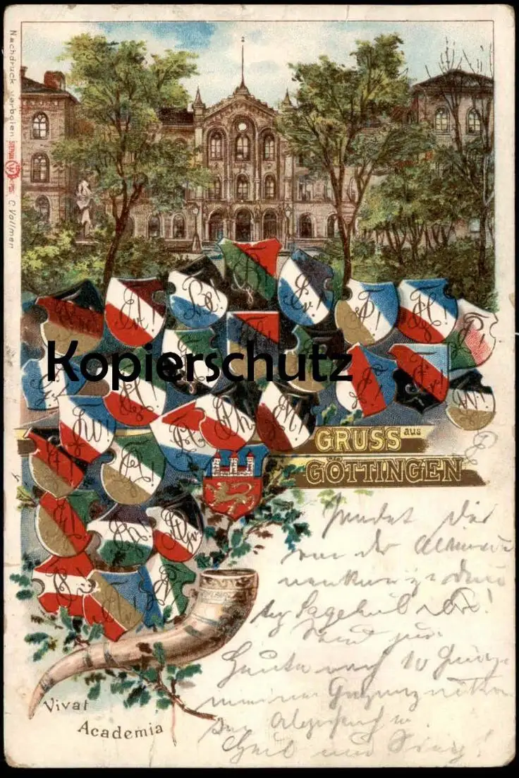 ALTE LITHO POSTKARTE GRUSS AUS GÖTTINGEN VIVAT ACADEMIA STUDENTENVERBINDUNGEN TRINKHORN