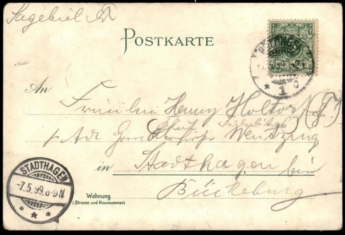Gelaufen: 07.05.1899 mit Stempel Göttingen nach Stadthagen bei Bückeburg, Unterschrift Sagebiel