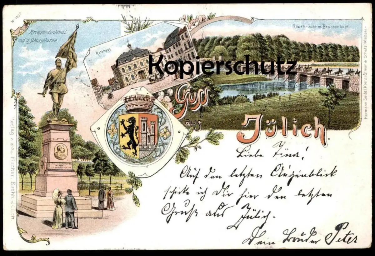 ALTE LITHO POSTKARTE GRUSS AUS JÜLICH 1897 KRIEGERDENKMAL ROERBRÜCKE BRÜCKENKOPF WAPPEN Ansichtskarte AK cpa postcard
