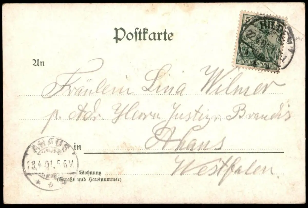 Gelaufen: 22.04.1901 mit Stempel Hilden nach Ahaus
