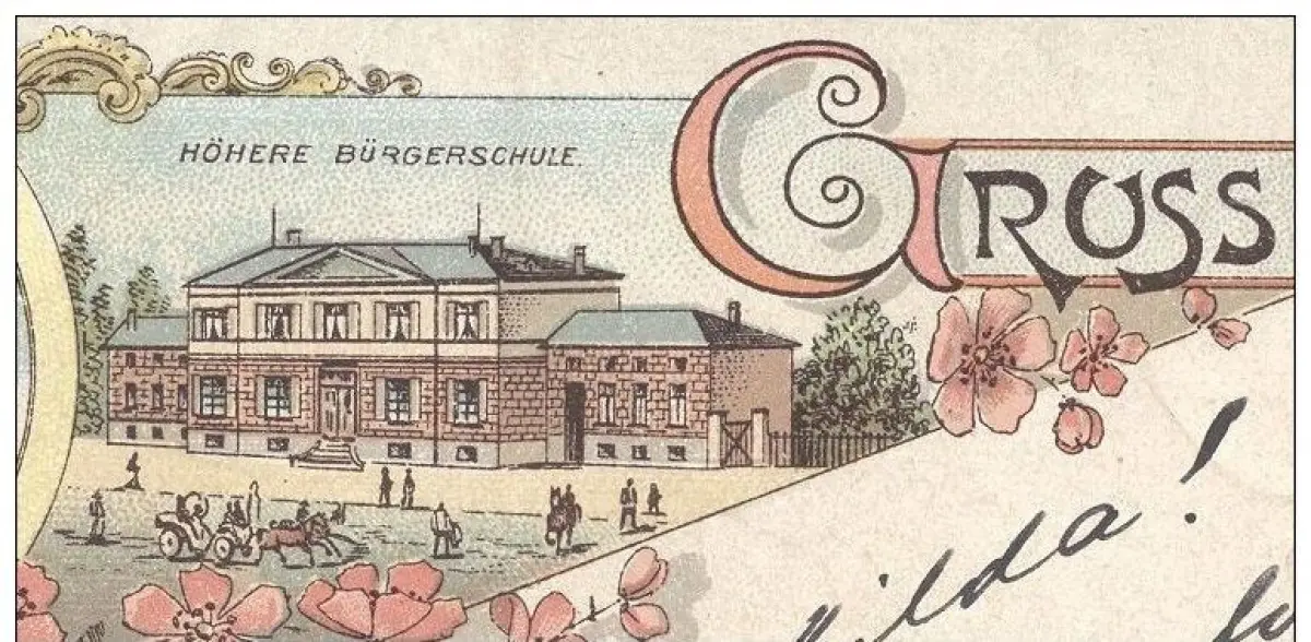 ALTE LITHO-POSTKARTE GRUSS AUS RHEYDT HÖHERE BÜRGERSCHULE BISMARK-DENKMAL RATHAUS STADTWAPPEN