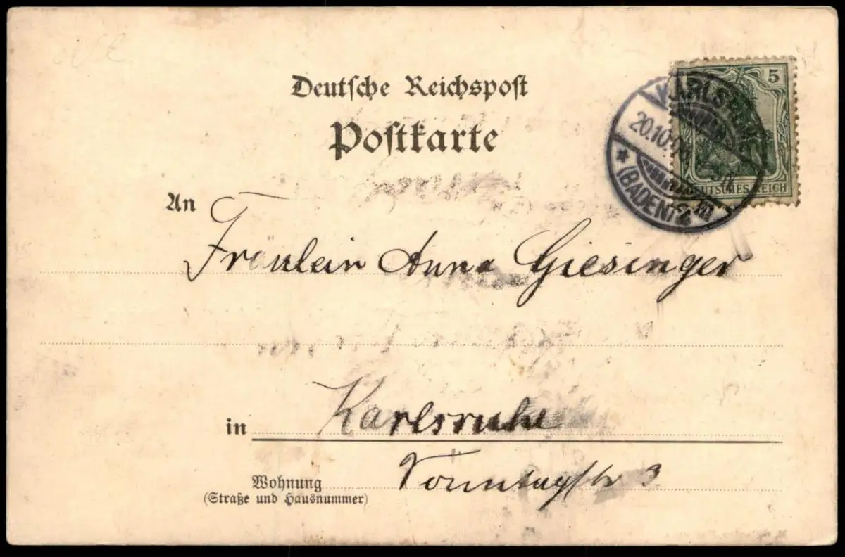 Verlag: M. Gillardon, KarlsruheGelaufen: 20.10.1906 mit Stempel Karlsruhe nach Karlsruhe "Unsere beabsichtigte Tour nach Baden-Baden führen wir nicht aus, kommen also Sonntag bis dahin Grüße dich herzlich in Eile..."Erhaltung (s. Scan): gut / 915464