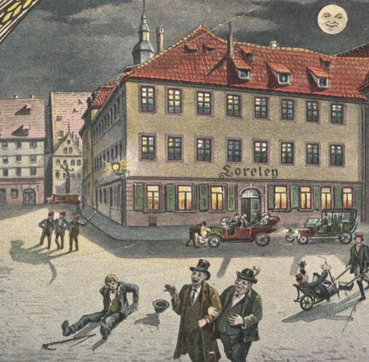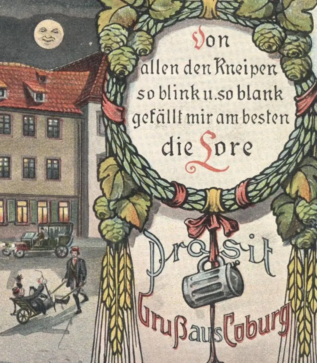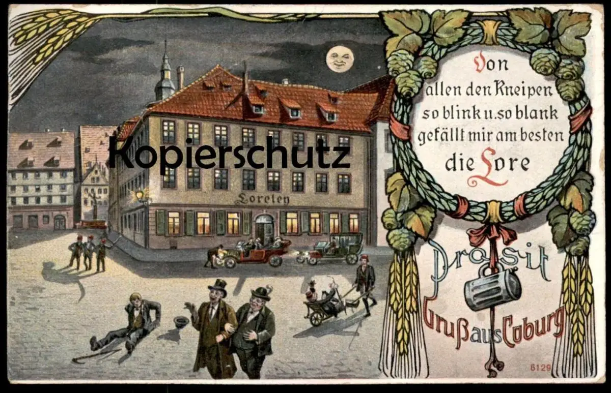 ALTE LITHO POSTKARTE PROSIT GRUSS AUS COBURG LORELEY GASTSTÄTTE LORE Mond Alkohol alcohol drunken postcard Schubkarre