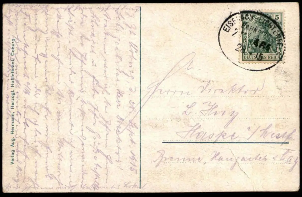 Gelaufen: 28.09.1915 mit Bahnpost-Stempel Zug 464 Eisenach Lichtenfels