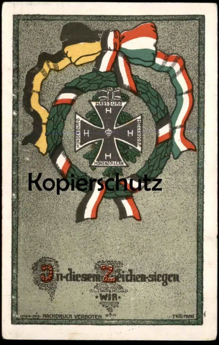 ALTE POSTKARTE 1. WELTKRIEG IN DIESEM ZEICHEN SIEGEN WIR HABSBURG HOHENZOLLERN HINDENBURG HÖTZENDORF FRITZ PAPKE AK cpa