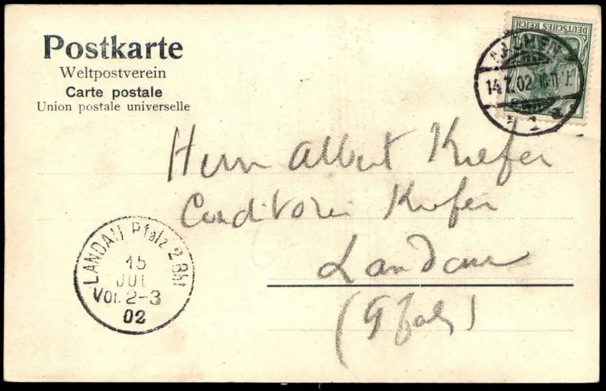Gelaufen: 14.07.1902 mit Stempel Aachen nach Landau Pfalz