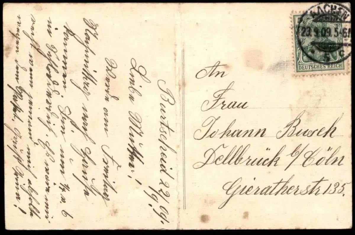 Gelaufen: 23.09.1909 mit Stempel Aachen nach Dellbrück bei Cöln (Köln)