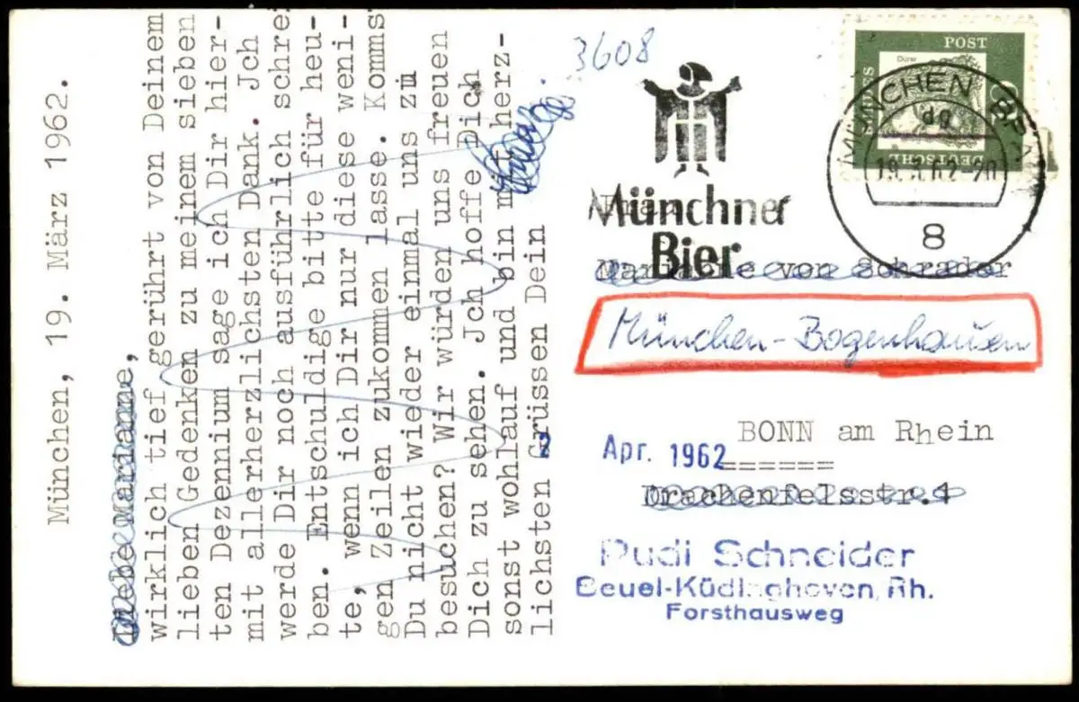 Gelaufen: 19.03.1962 mit Stempel München Münchner Bier nach Bonn
