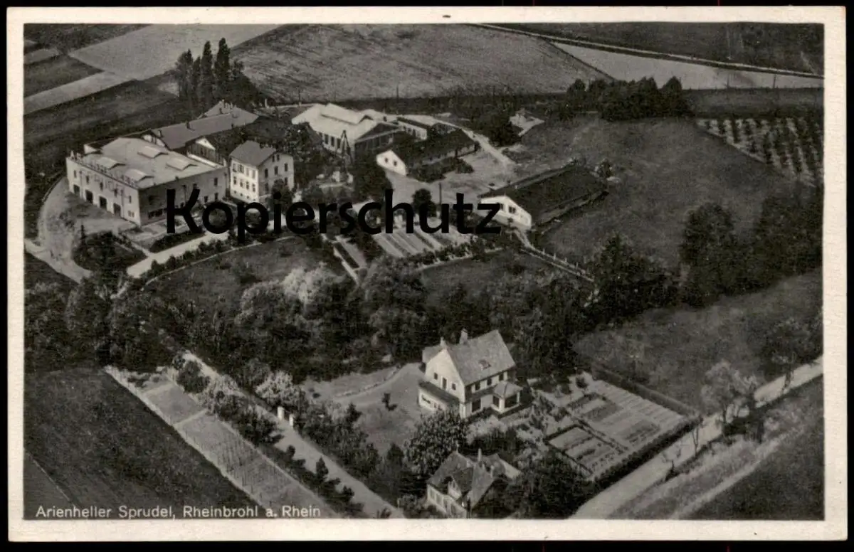 ALTE POSTKARTE ARIENHELLER SPRUDEL RHEINBROHL AM RHEIN FLIEGERAUFNAHME ARIENHELLER SPRUDEL UND KOHLENSÄURE AKTIENGESELLSCHAFTVerlag: unbekannt