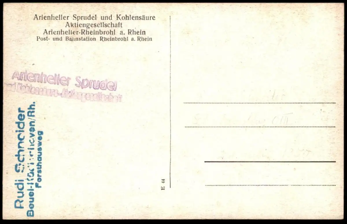Gelaufen: nein, mit zwei Stempel versehen (Arienheller Sprudel und Kohlensäufe Aktiengesellschaft sowie Namensstempel)Erhaltung (s. Scan): gut - sehr gut / 918274