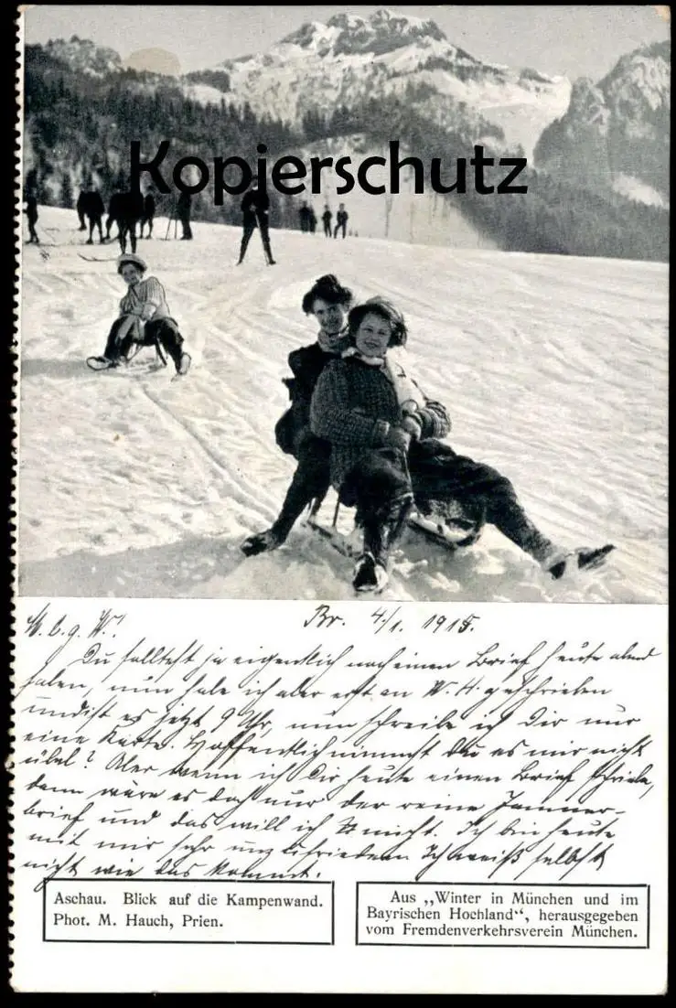 ALTE POSTKARTE ASCHAU BLICK AUF DIE KAMPENWAND 1915 SKI RODEL FREMDENVERKEHRSVEREIN MÜNCHEN LUGE SLEIGH Schlitten Winter