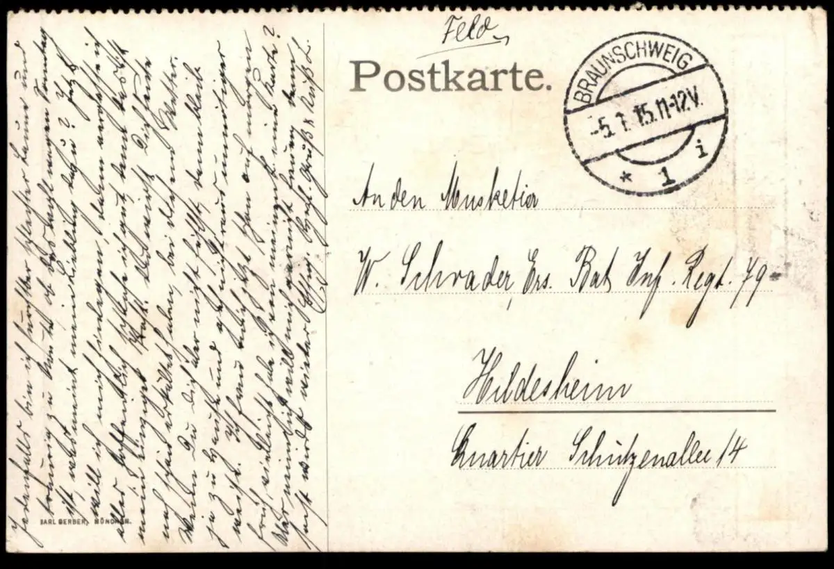 Gelaufen: 05.01.1915 als Feldpost mit Stempel Braunschweig nach Hildesheim Quartier Schützenallee