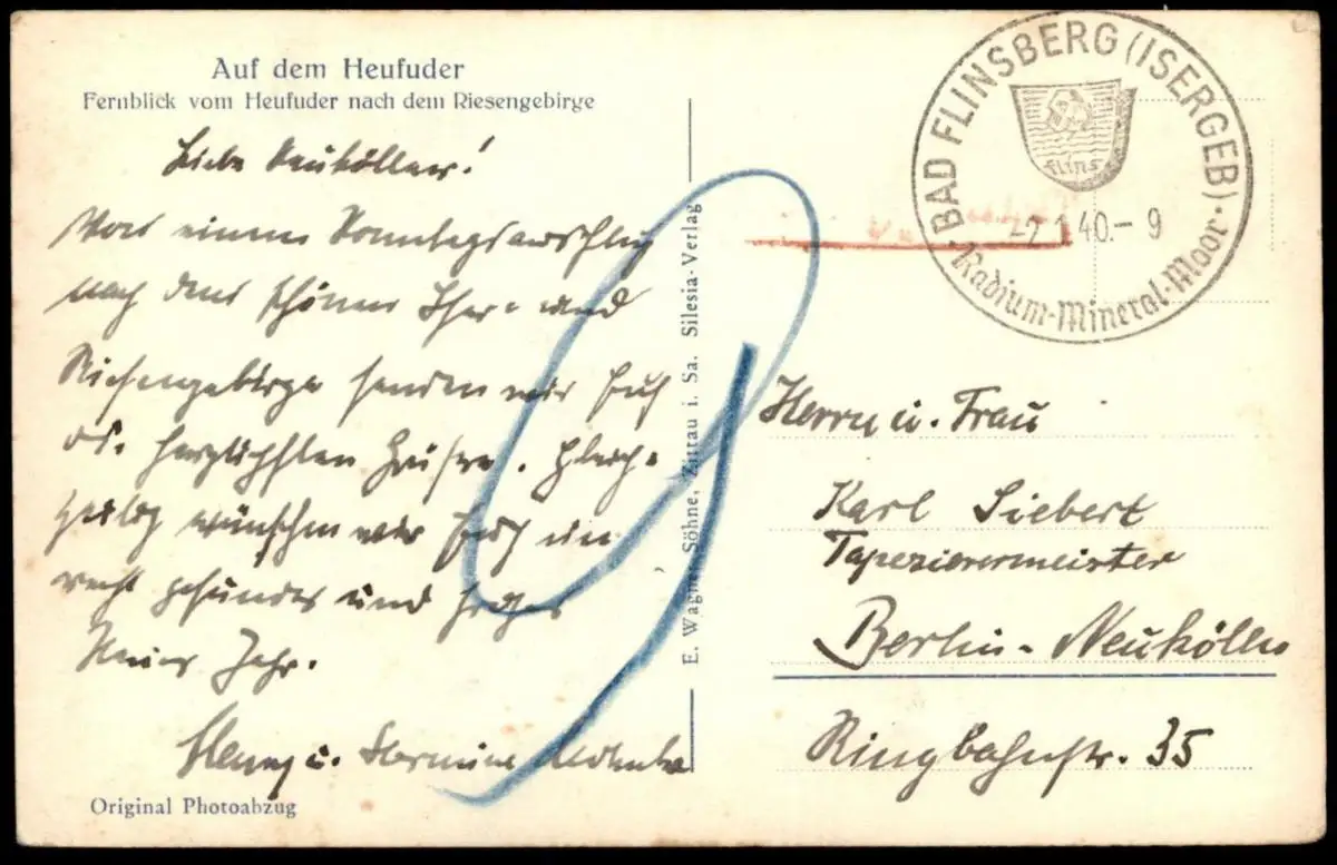 Gelaufen: 02.01.1940 mit Stempel Bad Flinsberg Radium Mineral Moor Isergebirge nach Berlin Neukölln