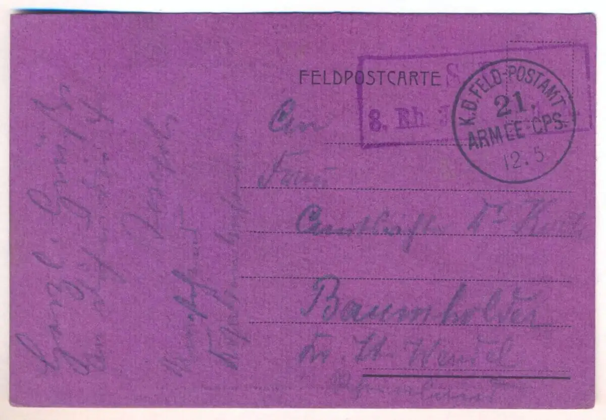 Gelaufen: 12.05.191x als Feldpost mit Stempel K.D. Feld-Postamt 21. Armee CPS nach Baumholder