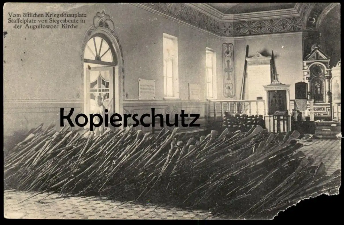 ALTE POSTKARTE VOM ÖSTLICHEN KRIEGSSCHAUPLATZ STAFFELPLATZ VON SIEGESBEUTE IN DER AUGUSTOWOER KIRCHE AUGUSTOWOVerlag: Gebrüder Hochland, Königsberg i. Pr. Originalaufnahme von Photograph A. Kühlewind, offizieller Kriegsphtotgraph, Königsberg i. Pr.