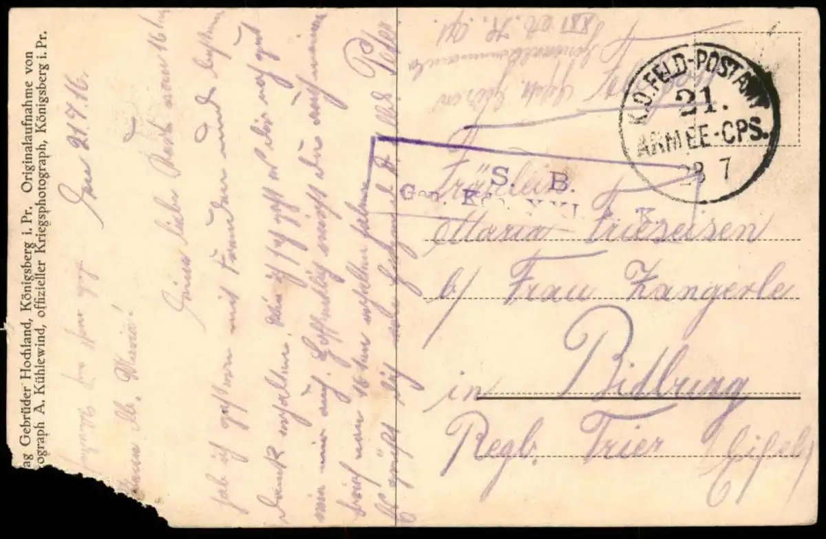 Gelaufen: 23.07.1916 nach Bitburg Bezirk Trier
