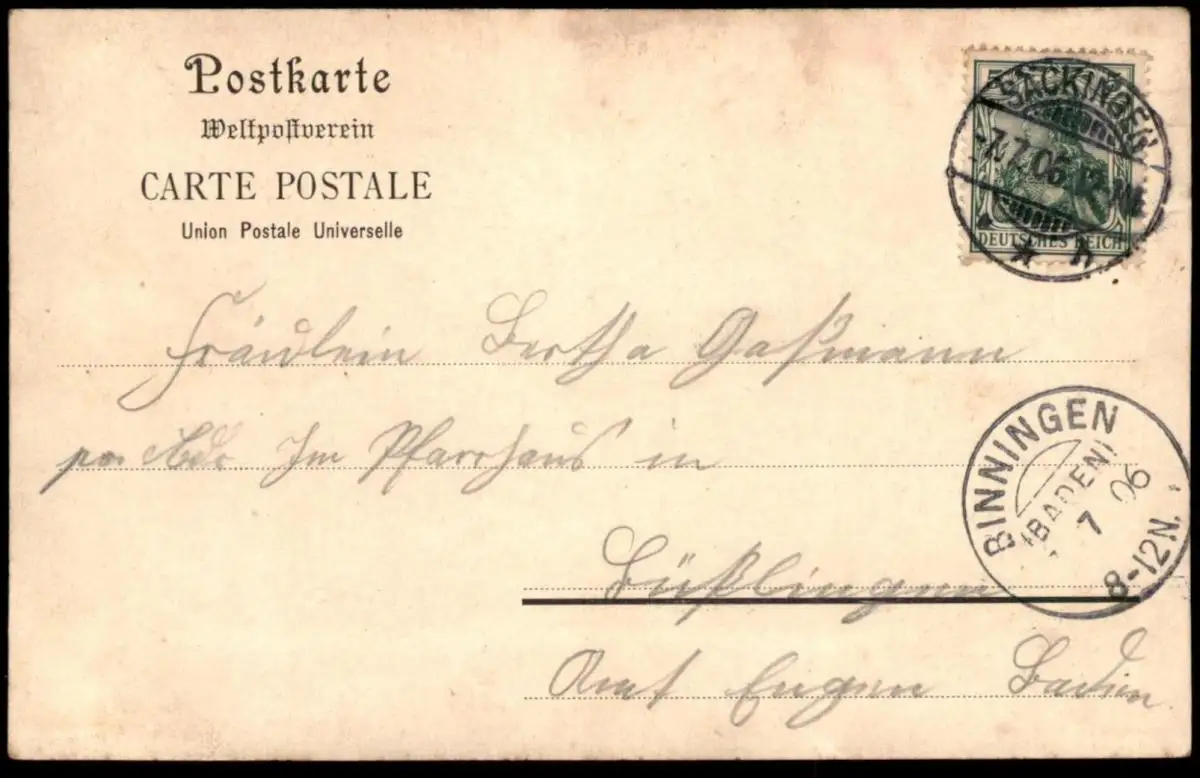 Gelaufen: 07.07.1906 mit Stempel Säckingen nach Lüsslingen