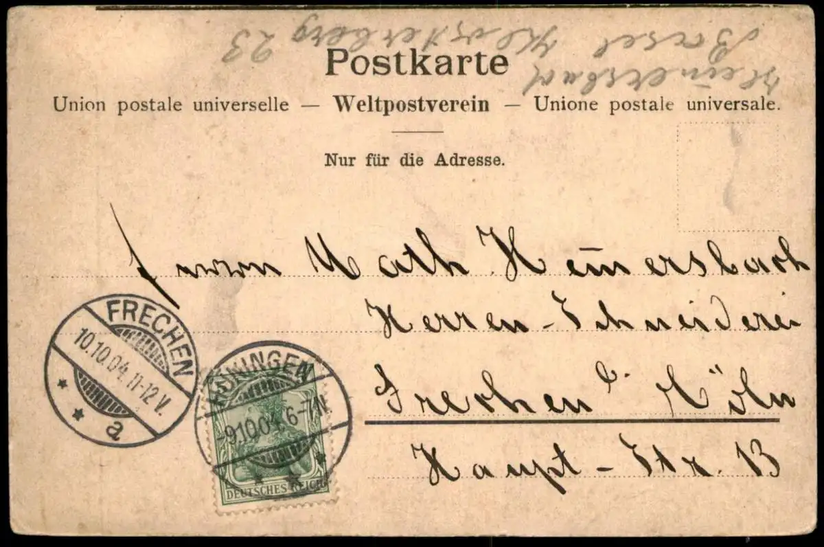 Gelaufen: 09.10.1904 mit Stempel Höningen nach Frechen an Mathias Hemmersbach Herren-Schneiderei (10.10.1904 mit Stempel Frechen)Erhaltung (s. Scan): gut / 918816