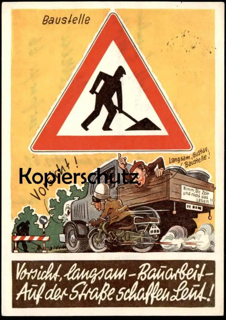 ALTE POSTKARTE BAUSTELLE VORSICHT LANGSAM GUSTAV BAUSTELLE SCHILD VERKEHRSSCHILD LKW MOTORRAD BAUARBEIT AUF DER STRASSE SCHAFFEN LEUT NIMM DIR ZEIT UND NICHT DAS LEBEN RÜCKSEITIGER STEMPEL ANNA GERN TABAK UND SÜSSWAREN SUDERBURG