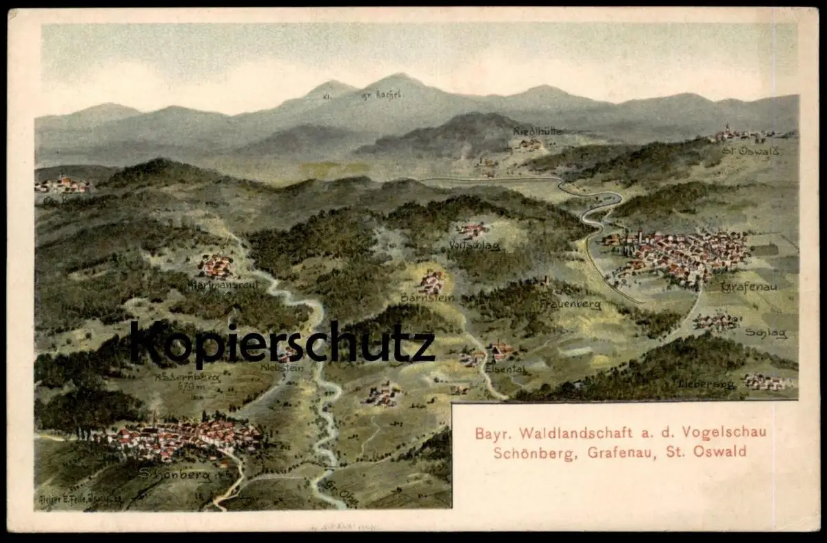 ALTE POSTKARTE BAYRISCHE WALDLANDSCHAFT AUS DER VOGELSCHAU SCHÖNBERG GRAFENAU ST. OSWALD BÄRNSTEIN KLEBSTEIN VOITSCHLAG RIEDLHÜTTE SCHLAG HARTMANSREUT VON EUGEN FELLE
