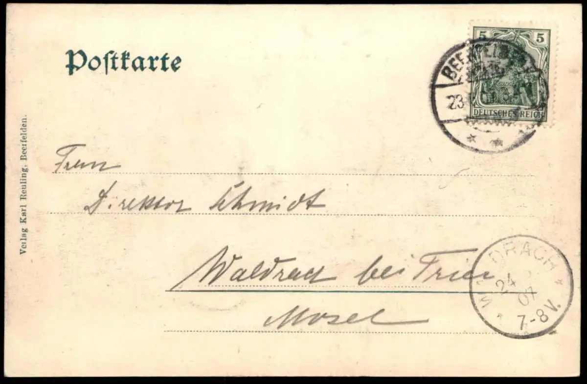 Gelaufen: 23.06.1907 mit Stempel Beerfelden nach Waldrach bei Trier