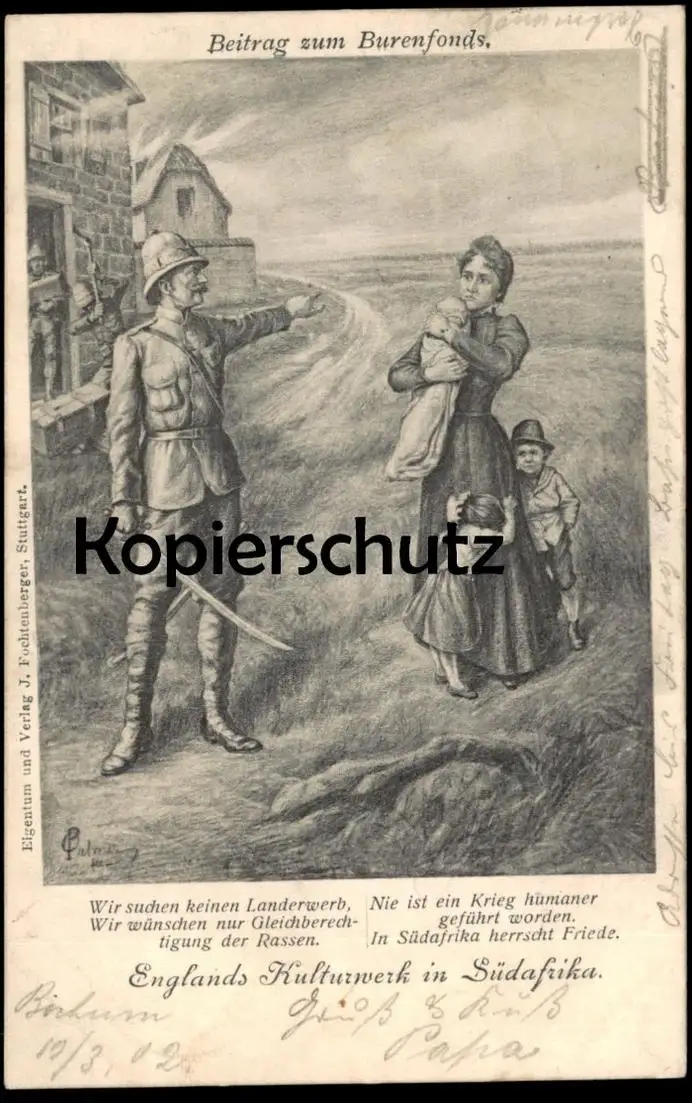 ALTE POSTKARTE BEITRAG ZUM BURENFONDS ENGLANDS KULTURWERK SÜDAFRIKA Wir suchen keinen Landerwerb, Wir wünschen nur Gleichberechtigung der Rassen. Nie ist ein Krieg humaner geführt worden. In Südafrika herrscht Friede.