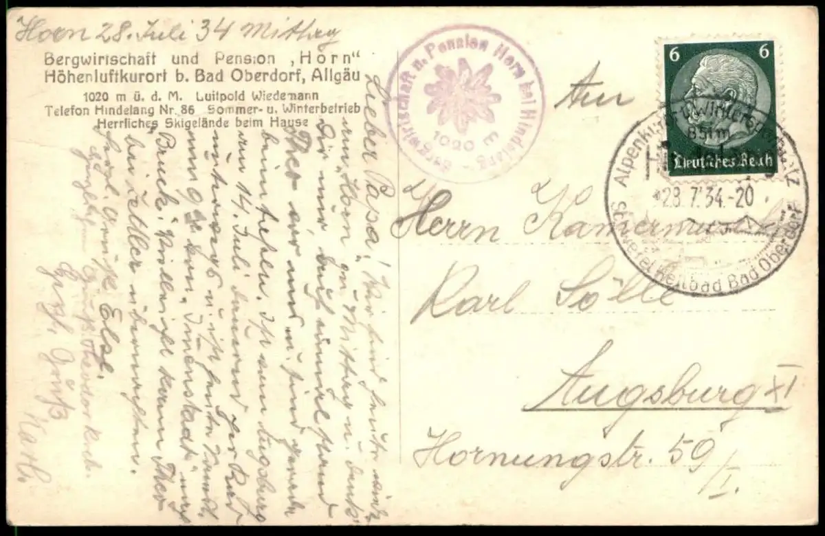 Gelaufen: 28.07.1934 mit Stempel Alpenkurort Wintersportplatz Schwefelheilbad Bad Oberdorf nach Augsburg