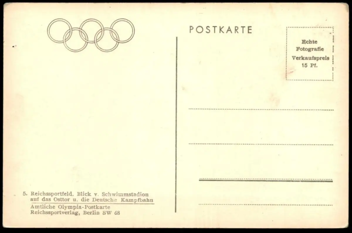 ALTE POSTKARTE BERLIN REICHSSPORTFELD, BLICK VOM SCHWIMMSTADION AUF DAS OSTTOR UND DIE DEUTSCHE KAMPFBAHN, AMTLICHE OLYMPIA POSTKARTEVerlag: Reichssportverlag, Berlin