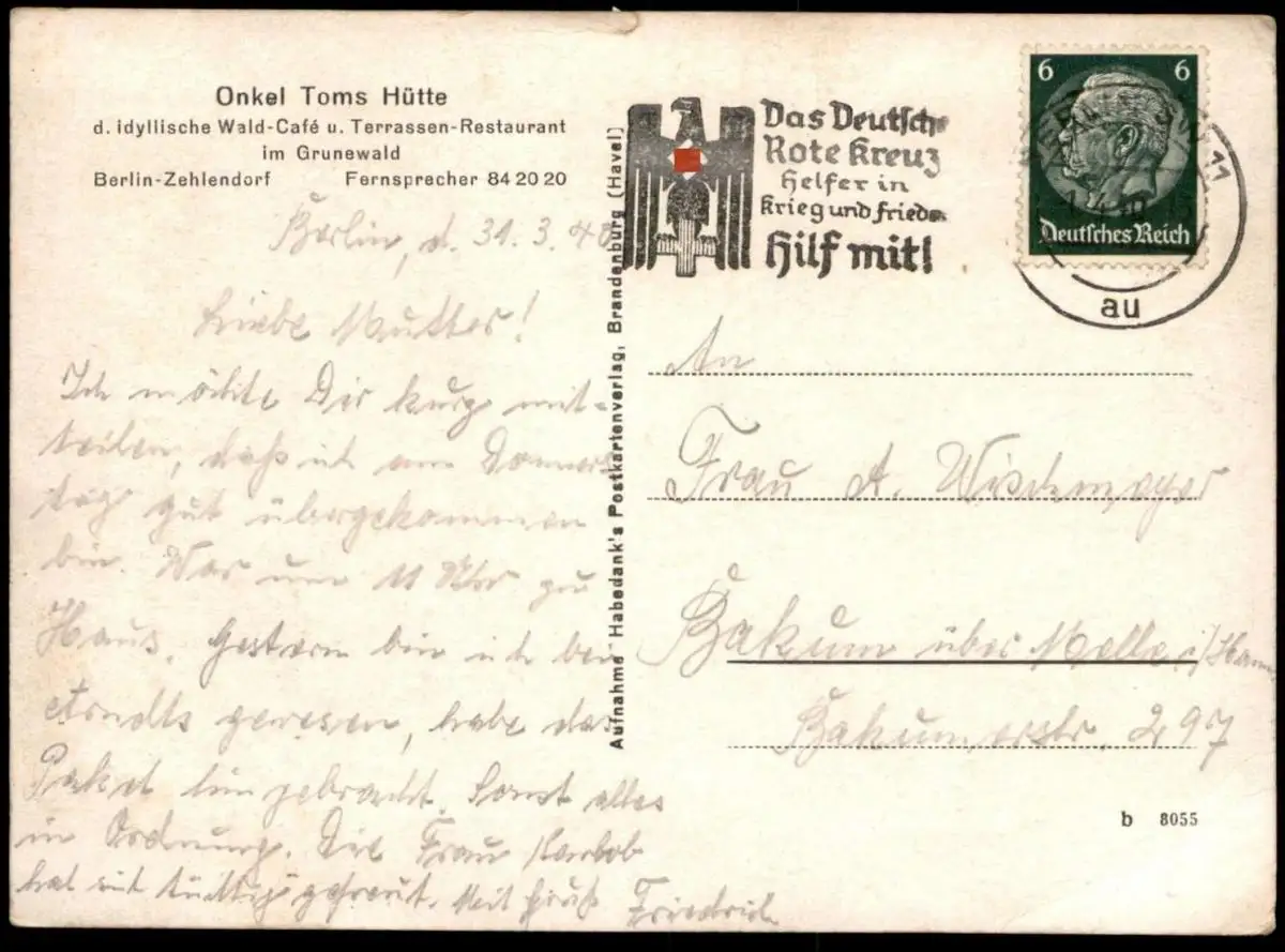 ALTE POSTKARTE ONKEL TOMS HÜTTE BERLIN ZEHLENDORF TANZDIELE UND PAVILLONVerlag: Aufnahme Habedank's Postkartenverlag, Brandenburg (Havel)Gelaufen: 01.04.1940 mit Stempel Berlin nach Bakum WischmeyerErhaltung (s. Scan): mittel, oben mittig kleiner Einriss / 915059