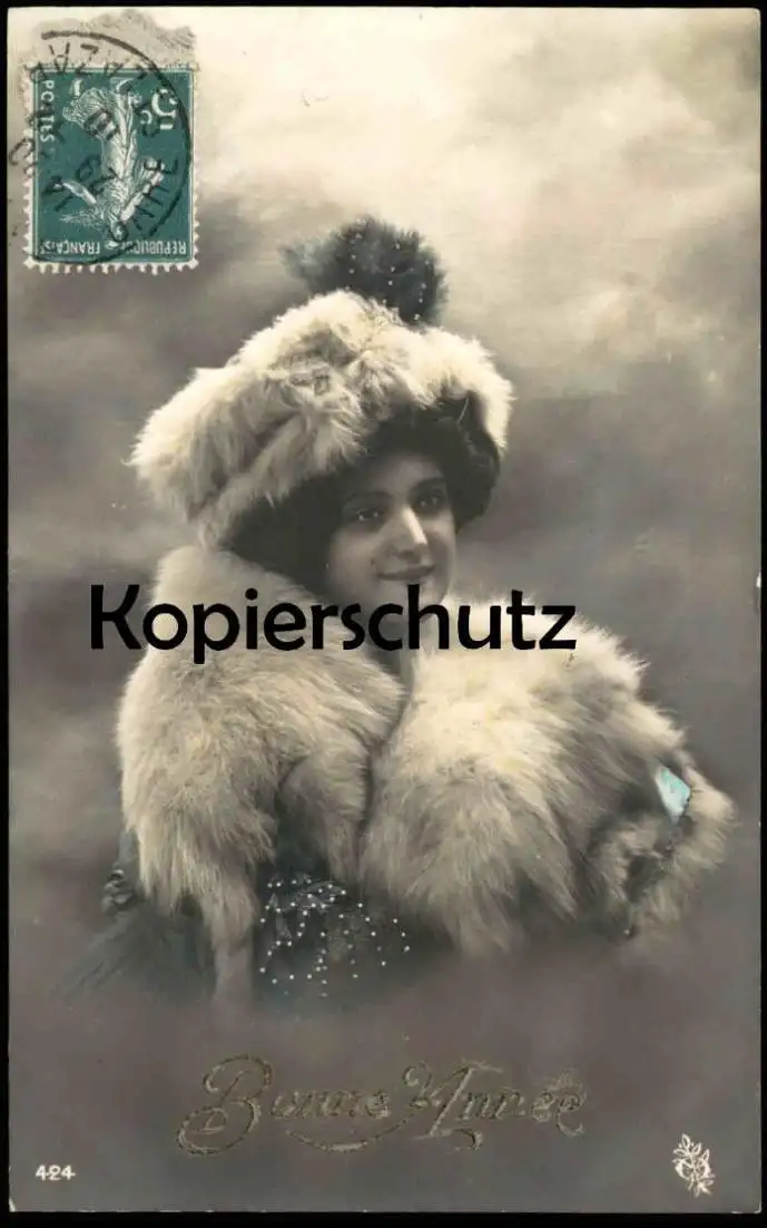 ALTE POSTKARTE BONNE ANNÉE FRAU MIT PELZ PELZMÜTZE PELZMANTEL fur femme woman fourrure Ansichtskarte AK cpa postcard