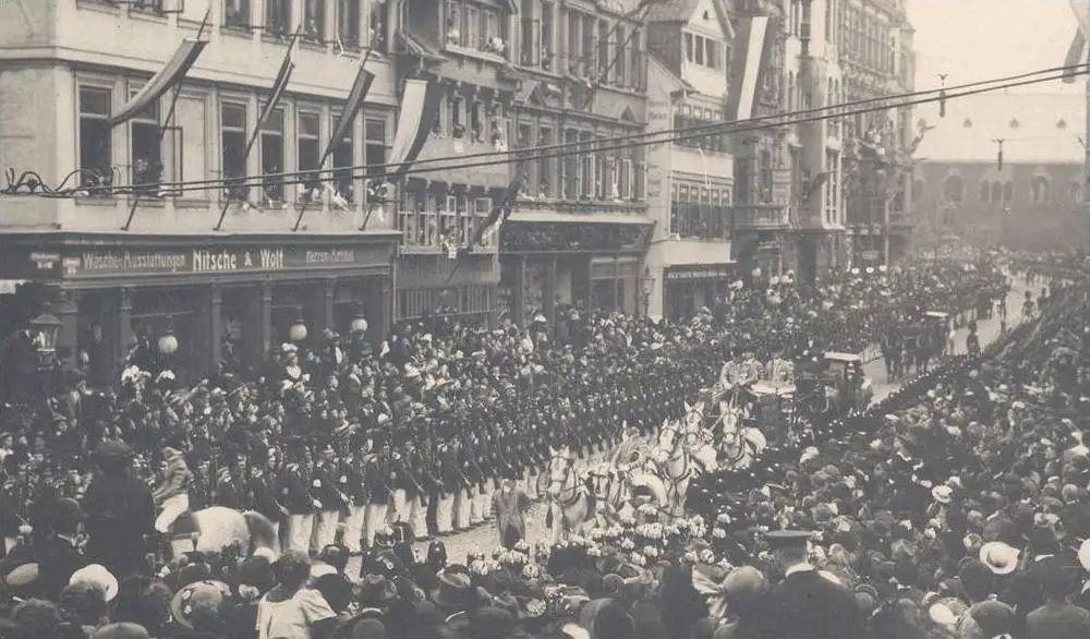 ALTE POSTKARTE BRAUNSCHWEIG FEST PARADE VERMUTLICH KAISERBESUCH GESCHÄFT WÄSCHE-AUSSTATTUNGEN NITSCHE & WOLF HERREN-ARTIKEL GARDINEN & VORHANGSTOFFEVerlag: Wilhelm Sievers, Braunschweig; Originalaufnahme von Ad. Sternitzki Nachf., BraunschweigGelaufen: nein