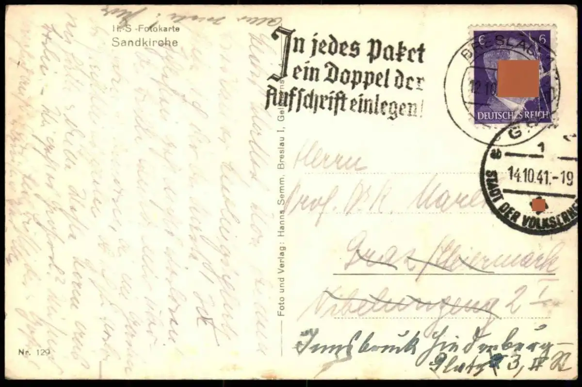 Gelaufen: 12.10.1941 mit Stempel Breslau "In jedes Paket ein Doppel der Aufschrift einlegen" sowie 14.10.1941 Stempel Graz nach Innsbruck weitergesendet
