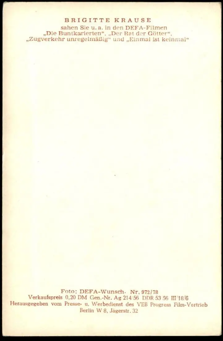 ALTE POSTKARTE BRIGITTE KRAUSE FILM-SCHAUSPIELERIN SEHEN SIE IN DEN DEFA FILME DIE BUNTKARIERTEN DER RAT DER GÖTTER ZUGVERKEHR UNREGELMÄSSIG EINMAL IST KEINMALVerlag: DEFA-Wunsch, Presse- und Werbedienst des VEB Progress Film-Vetrieb, Berlin