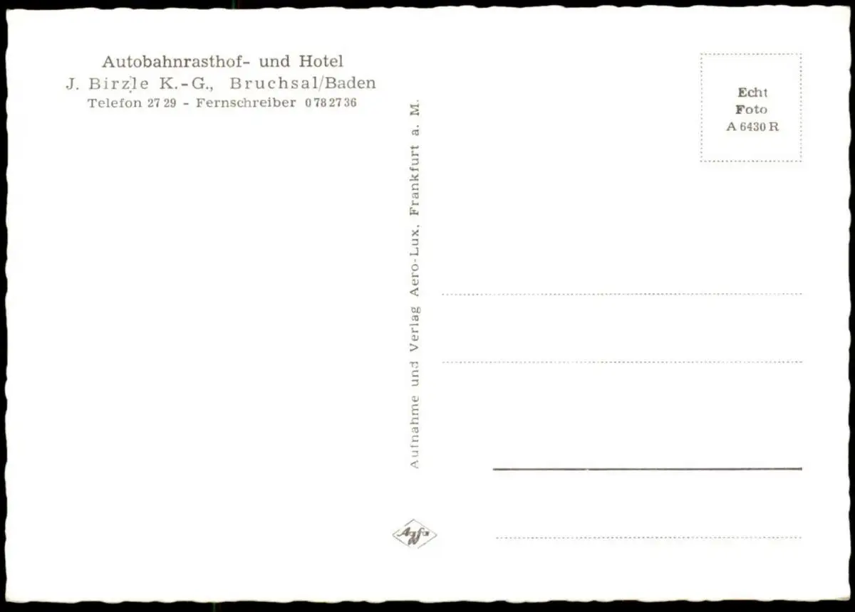 ALTE POSTKARTE BRUCHSAL AUTOBAHNRASTHOF- UND HOTEL J. BIRZLE K.G. LUFTBILD AUTOSVerlag: Aero-Lux, Frankfurt am Main