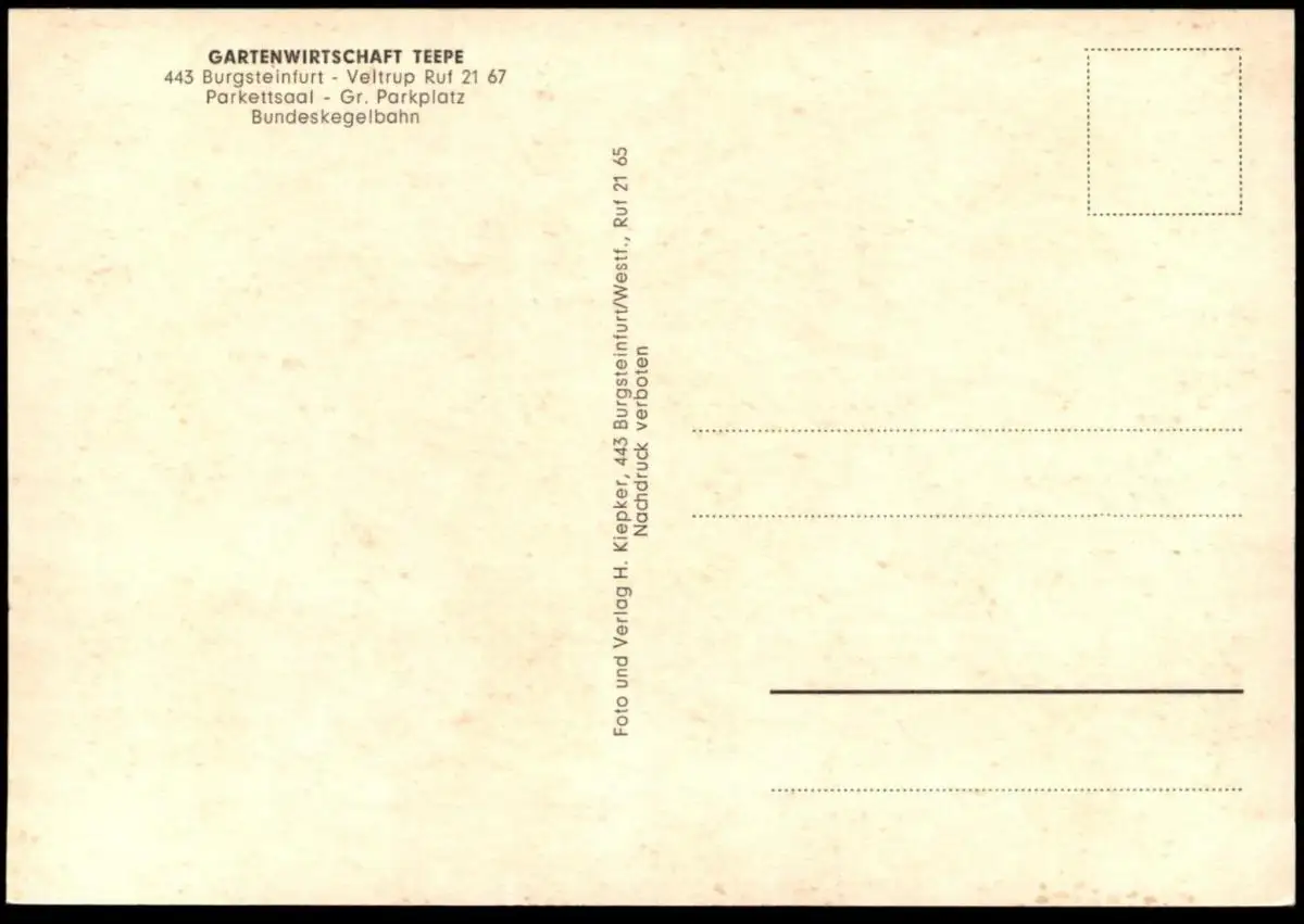 ALTE POSTKARTE BURGSTEINFURT VELTRUP GARTENWIRTSCHAFT TEEPE PARKETTSAAL BUNDESKEGELBAHN REKLAME ROLINCK BIER
