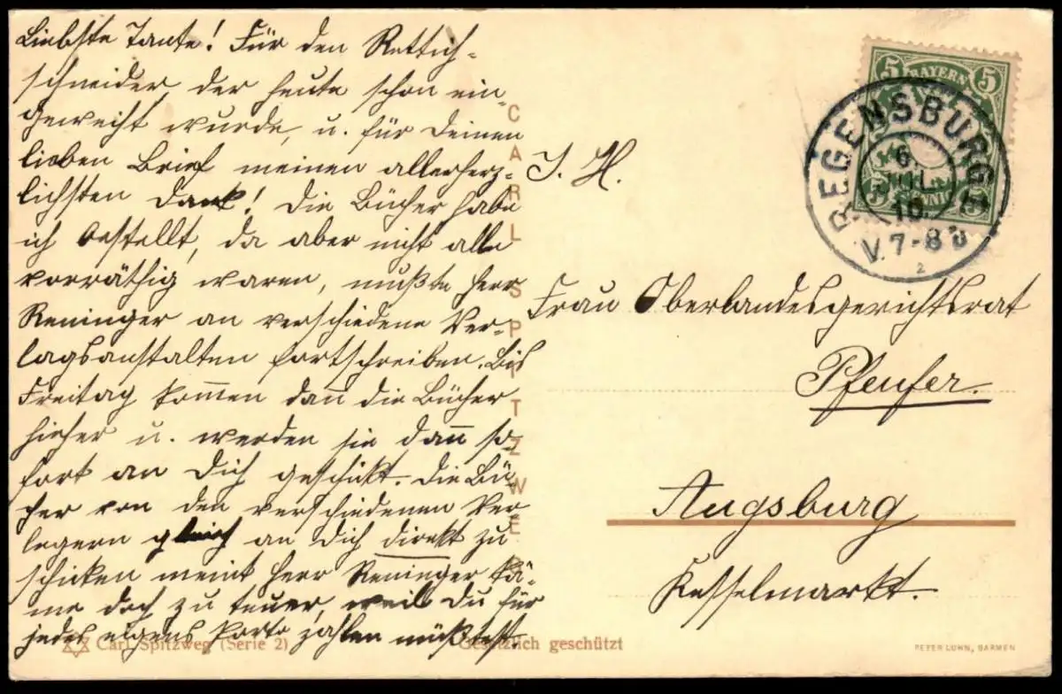 Gelaufen: 06.07.1910 mit Stempel Regensburg nach Augsburg