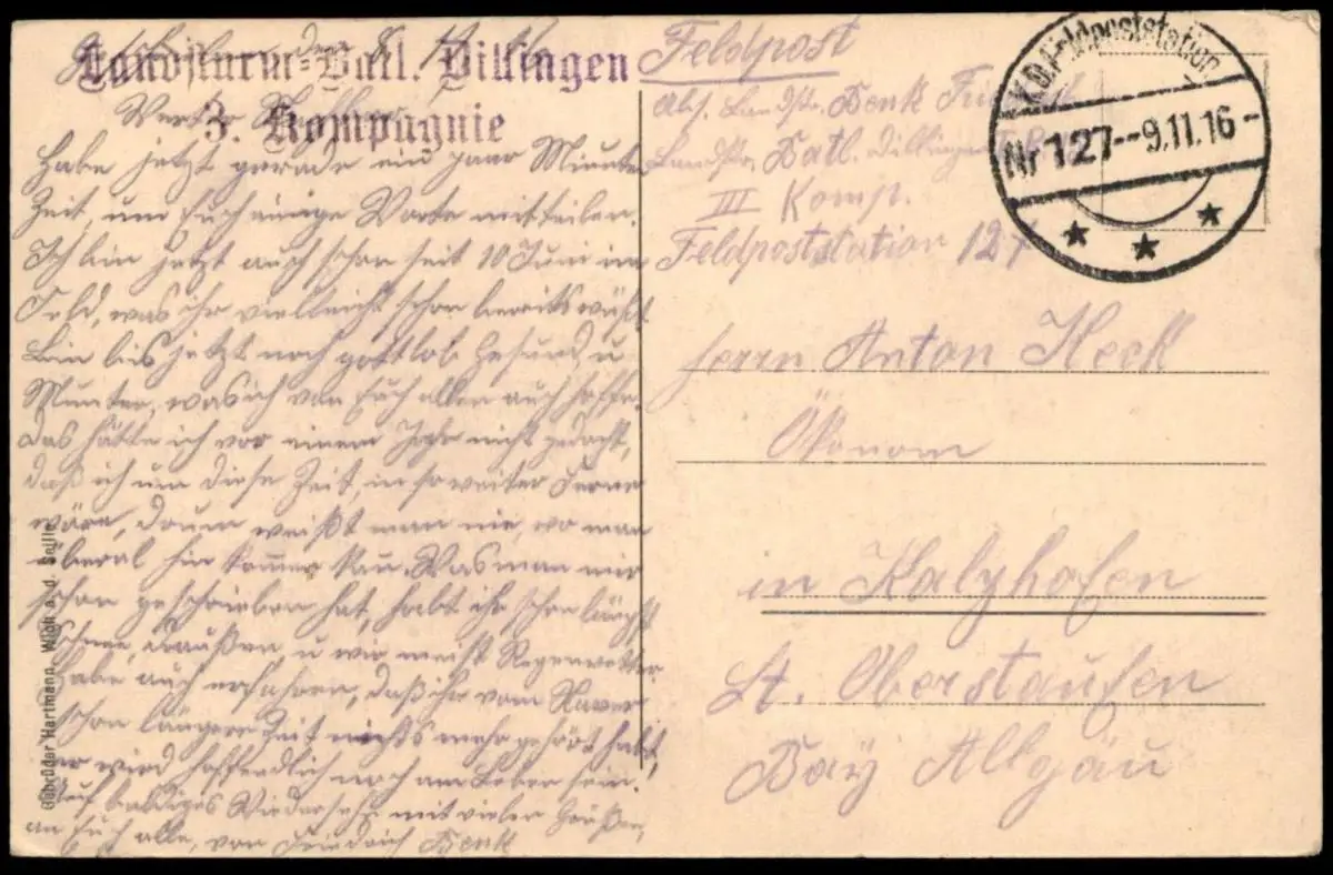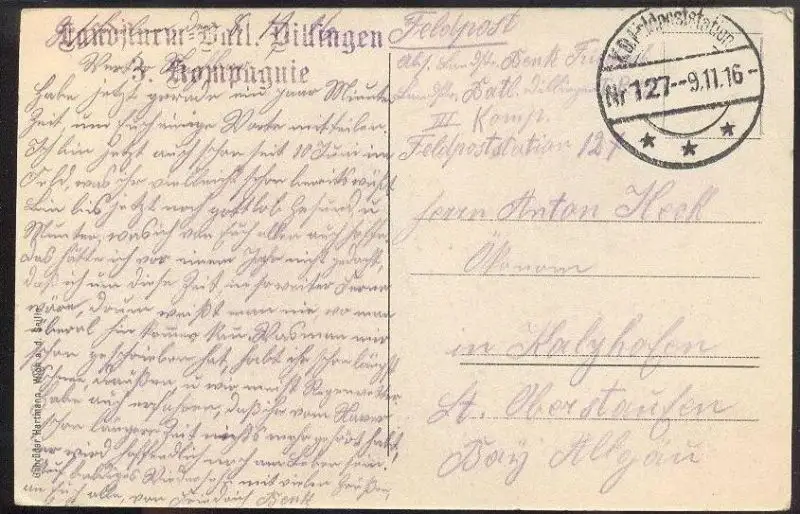Gelaufen: 09.11.1916 als Feldpost nach Kalzhofen Oberstaufen, zusätzlicher Stempel Landsturm-Bat.l. Dillingen 3. Komagnie